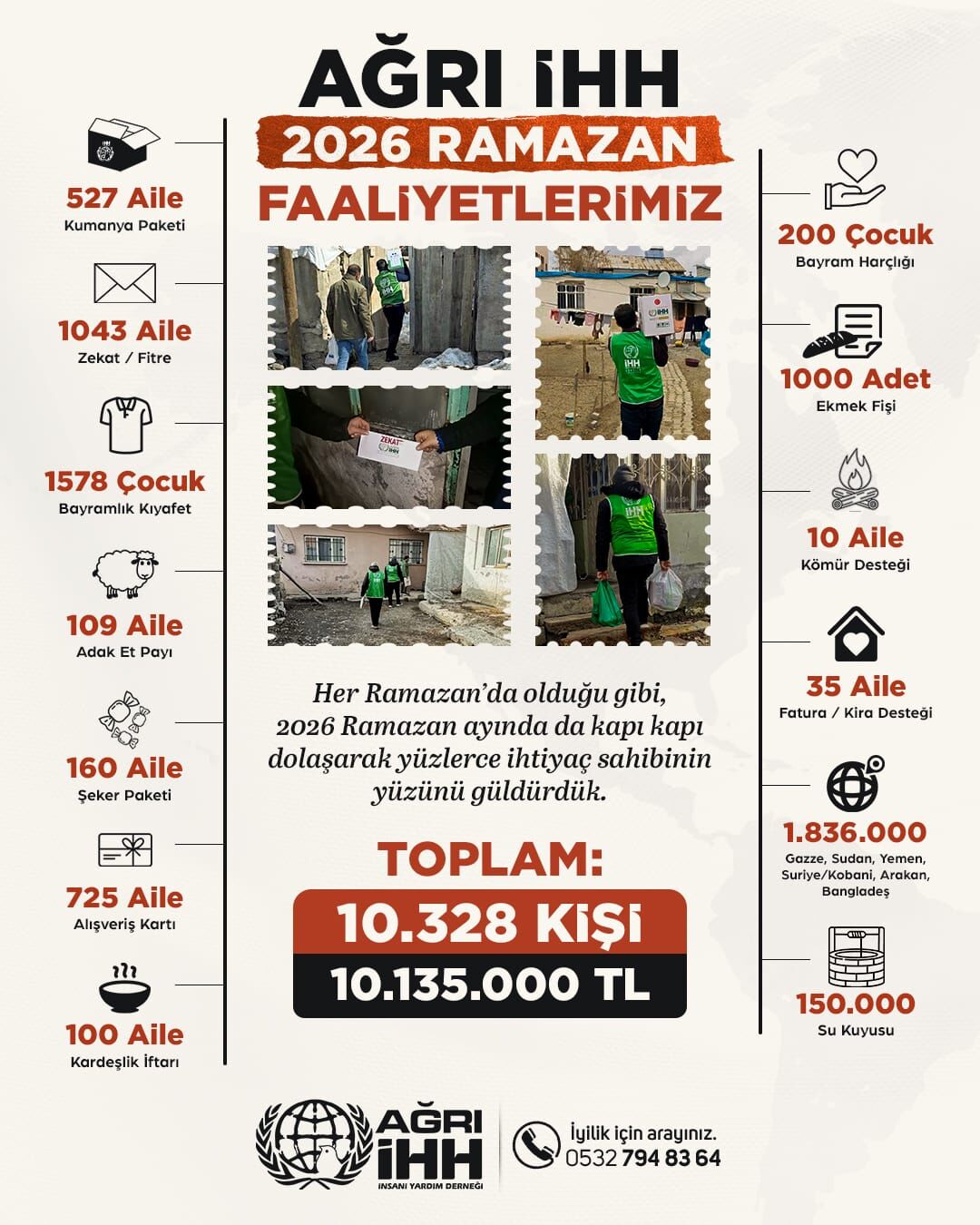 Ramazan ayı boyunca kapı kapı dolaşarak ihtiyaç sahiplerine ulaşan ekipler, gıda kolisinden bayramlık kıyafete, zekât ve fitreden alışveriş kartına kadar birçok alanda destek sağladı. Açıklanan verilere göre;
