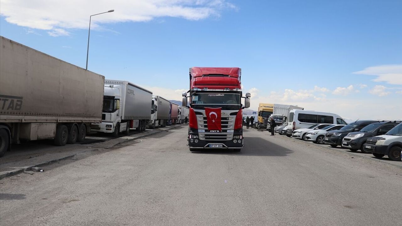 Van'dan yola çıkan tıbbi yardım malzemeleri yüklü 6 tır, Doğubayazıt ilçesine geldi.